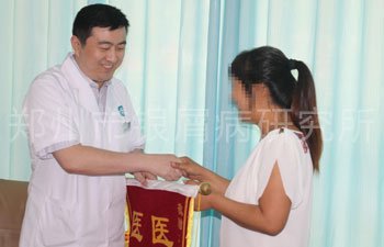李女士把锦旗送至刘长江主任手上感谢他的治疗