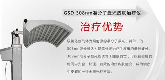 GSD 308nm准分子激光治疗仪是以氯化氙气体为照射源的准分子激光,其单一的308nm波长被认为是紫外光治疗银屑病的最佳波长。研究表明准分子激光比传统的疗法能更好的诱导T细胞凋亡,并促进色素的合成,治疗时间短,能更准确针对患病皮肤。是目前治疗银屑病最有效的方法。